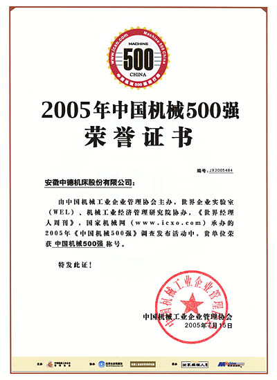 7月15日,2005年《中國機(jī)械500強(qiáng)》在北京人民大會堂隆重發(fā)布。其中一汽、上汽、中國兵器裝備集團(tuán)公司等50家上榜企業(yè)同時入選2005《世界機(jī)械500大》。此次活動是由中國機(jī)械工業(yè)企業(yè)管理協(xié)會主辦,世界企業(yè)實(shí)驗(yàn)室、機(jī)械工業(yè)經(jīng)濟(jì)管理研究院協(xié)辦,世界經(jīng)理人周刊和國家機(jī)械網(wǎng)聯(lián)合承辦的。此次評選中,金屬加工機(jī)械制造行業(yè)有19個企業(yè)入選;安徽省共有16個企業(yè)入選;馬鞍山市入選的有2家企業(yè)(除我公司外,還有星馬汽車股份有限公司進(jìn)入了500強(qiáng)企業(yè));在500強(qiáng)企業(yè)中我公司位列第484位。